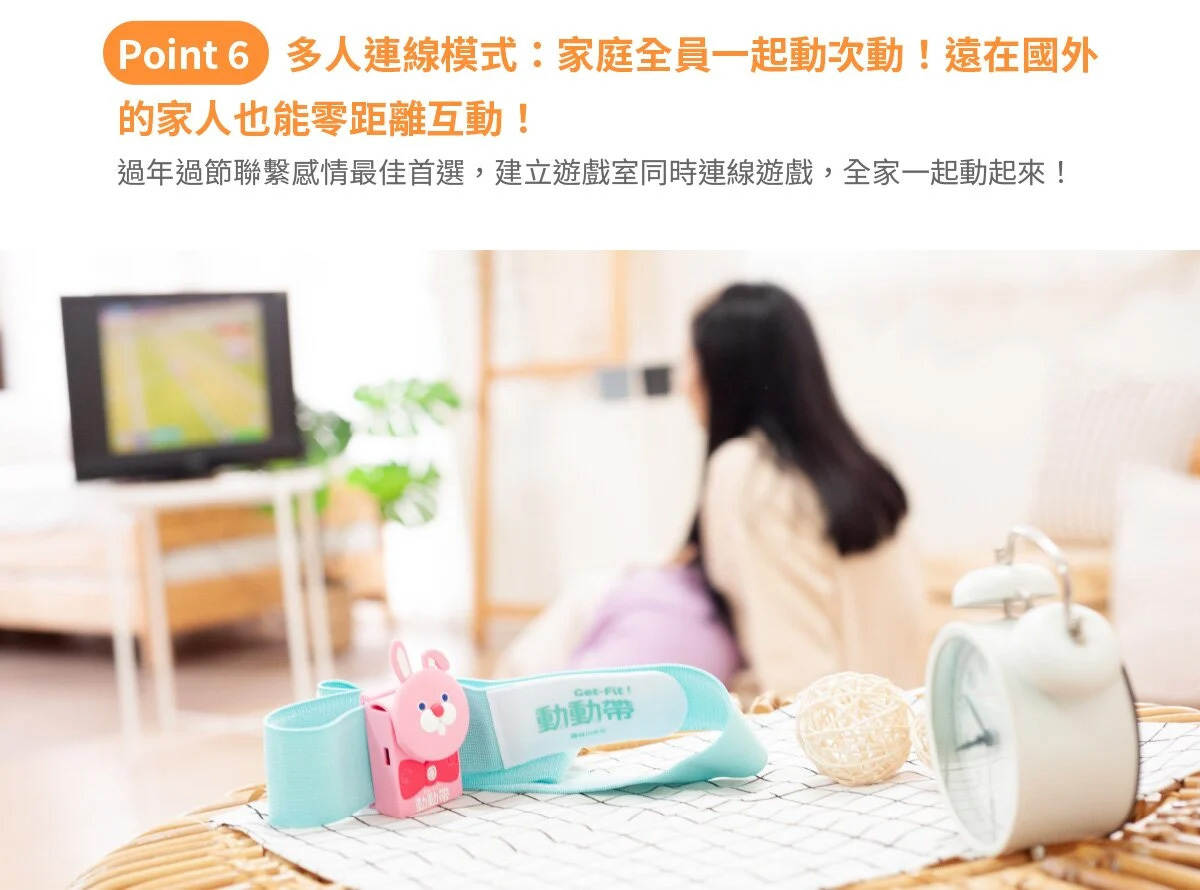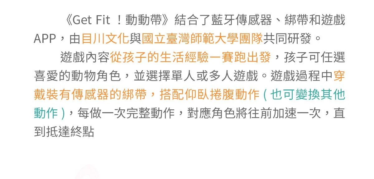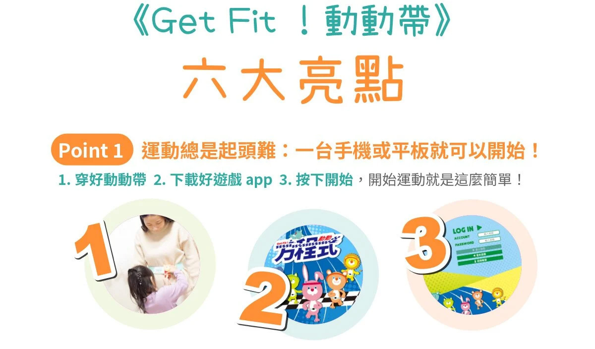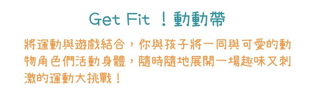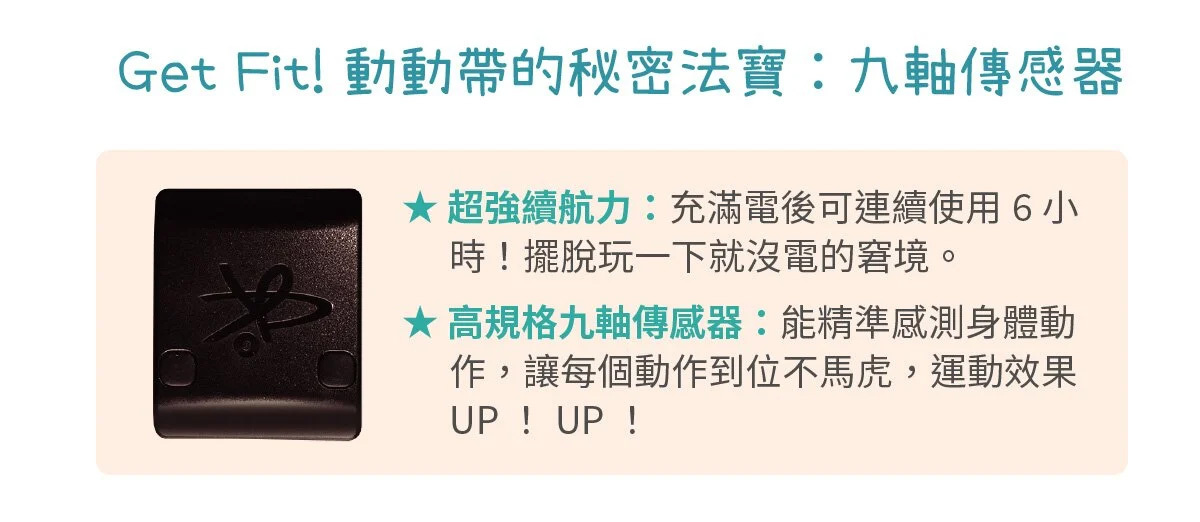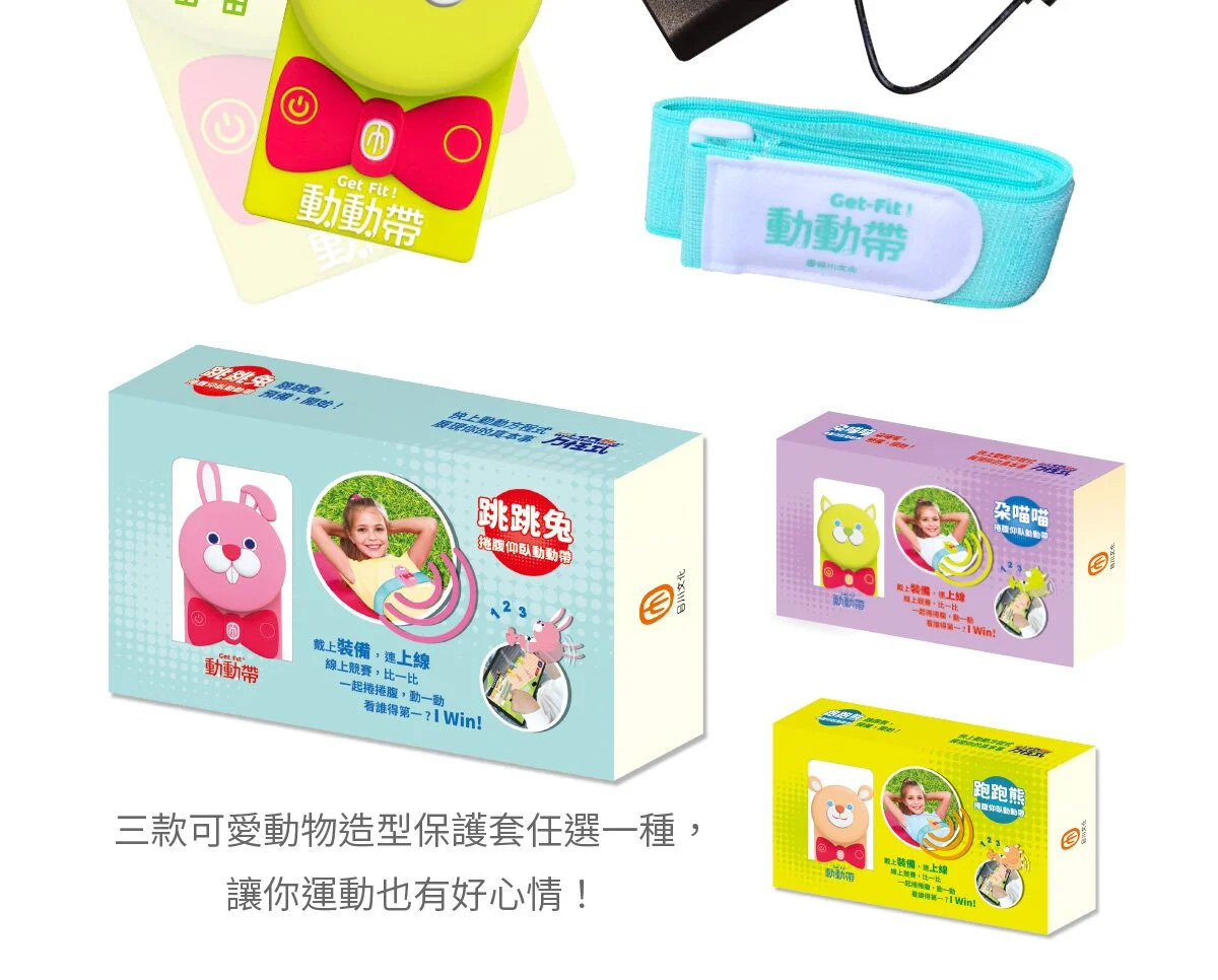 Get Fit! 動動帶為創新體適能產品,結合科技的傳感器、可愛造型保護套及鮮豔綁帶,搭配遊戲APP,讓你無限暢遊運動科技;不受場域限制,隨時隨地可與孩子一同體驗運動的樂趣,戴上喜歡的角色,就能在線上一起競賽,訓練體能、增強抵抗力!
