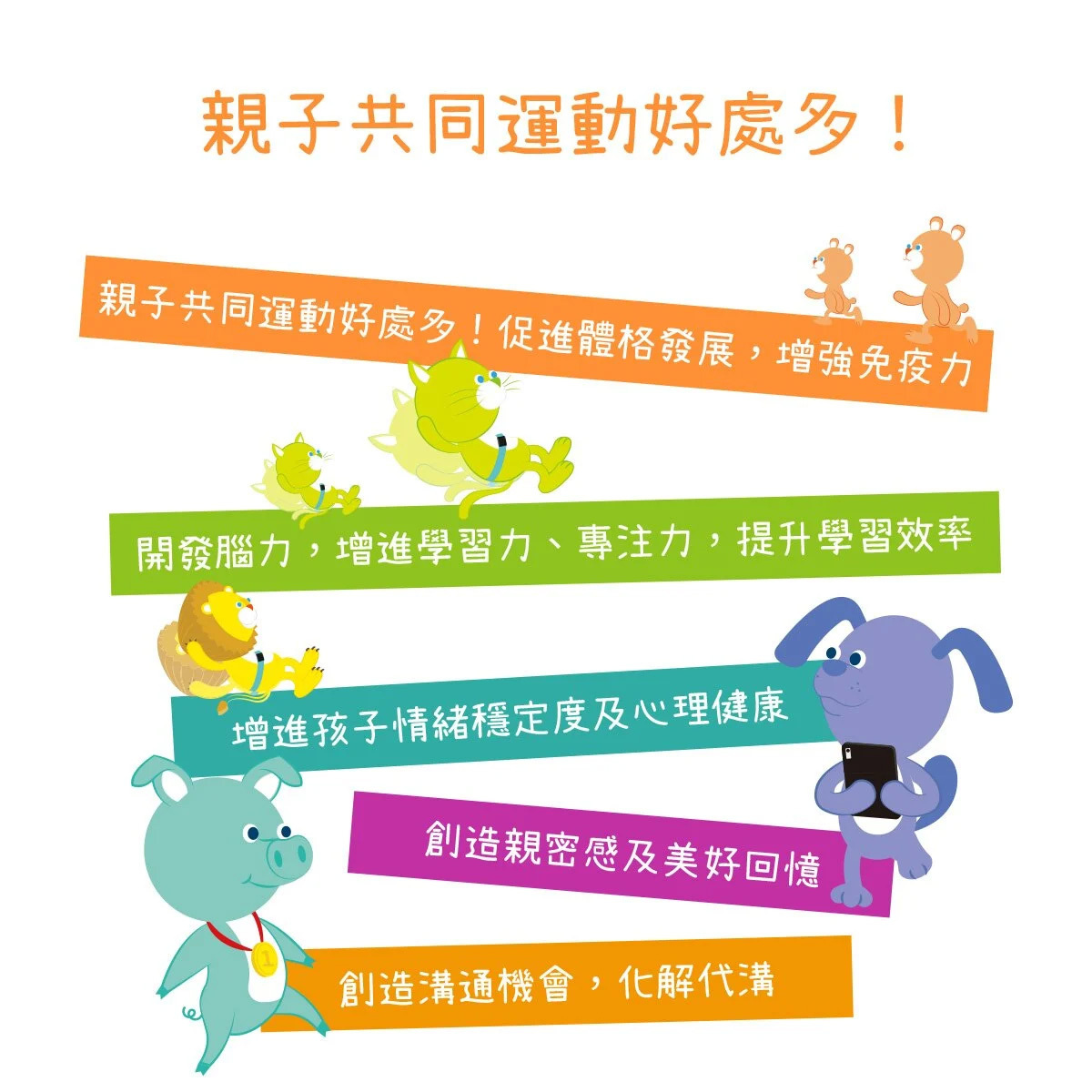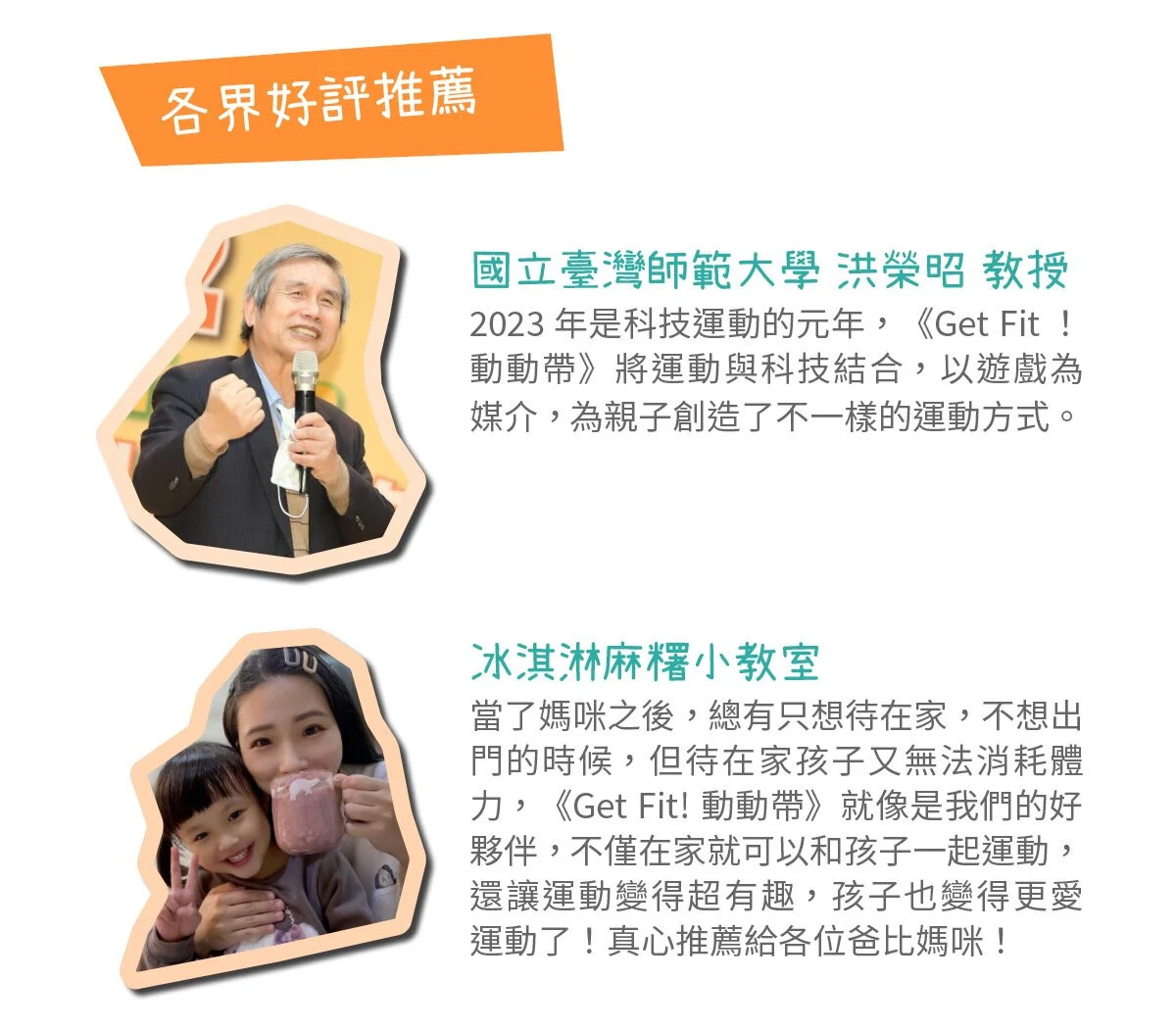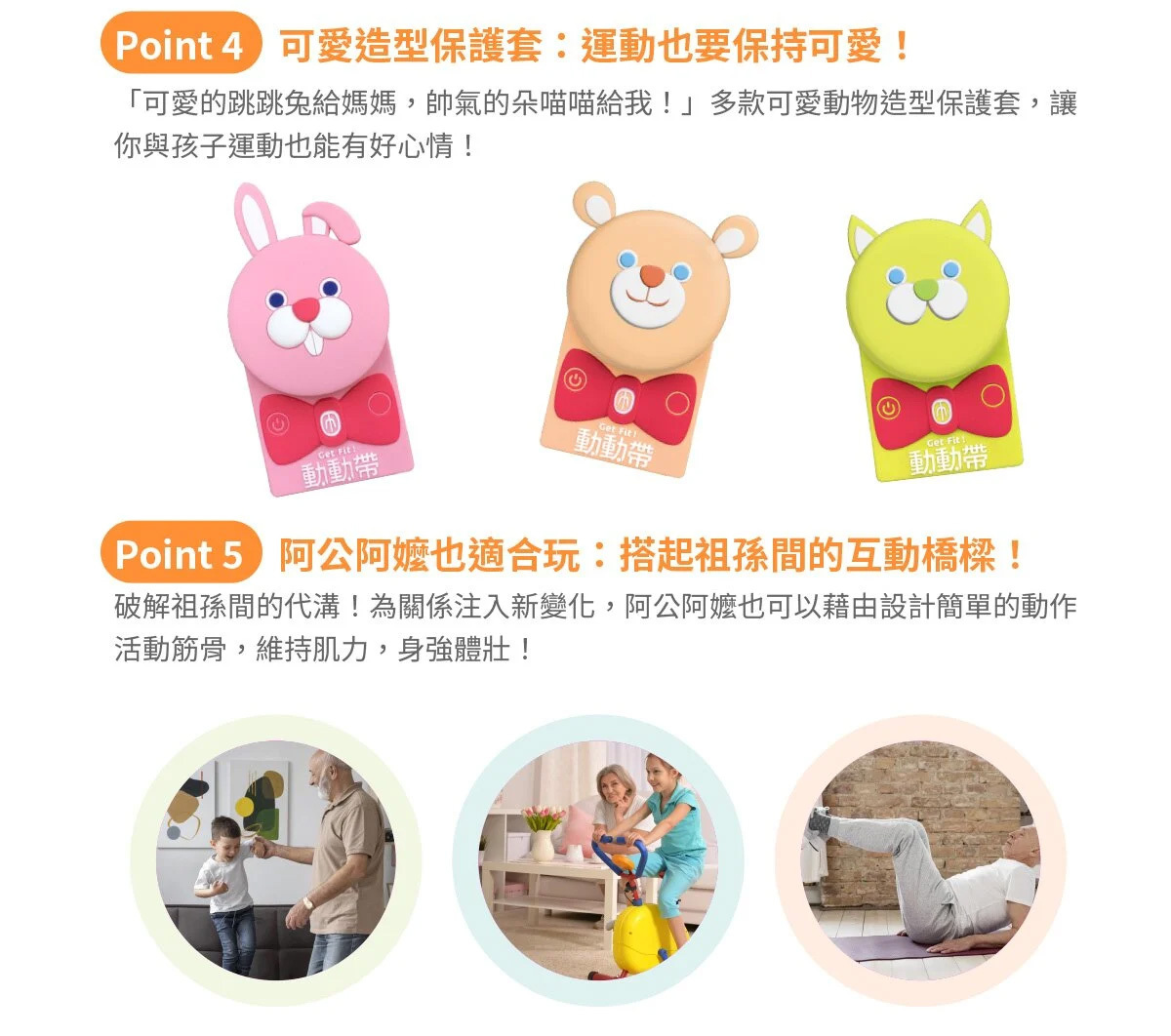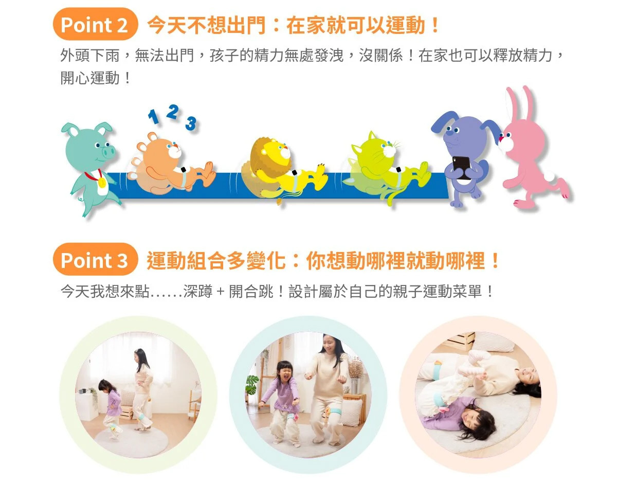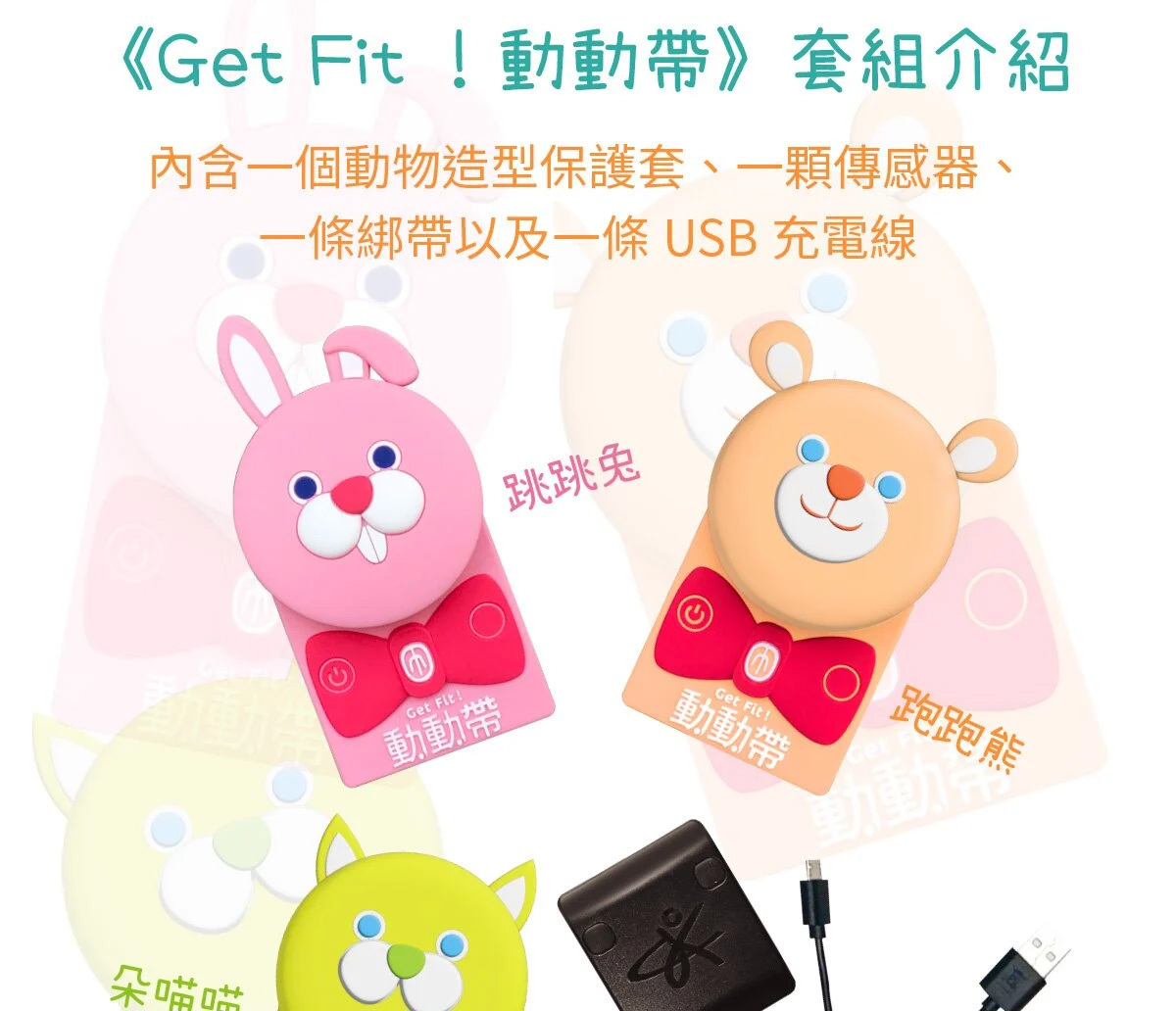Get Fit! 動動帶為創新體適能產品,結合科技的傳感器、可愛造型保護套及鮮豔綁帶,搭配遊戲APP,讓你無限暢遊運動科技;不受場域限制,隨時隨地可與孩子一同體驗運動的樂趣,戴上喜歡的角色,就能在線上一起競賽,訓練體能、增強抵抗力!